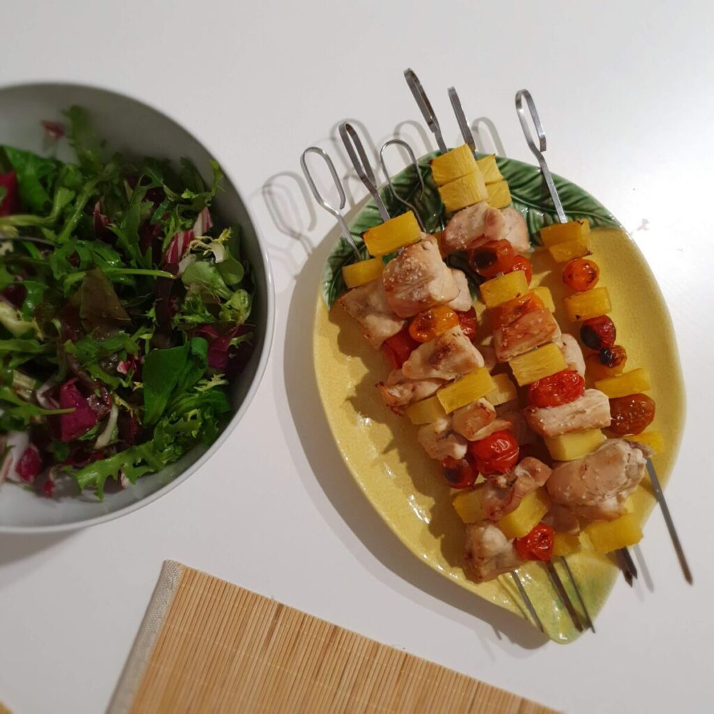 - Posteriormente, coloca nos espetos alternadamente frango, ananás, tomate