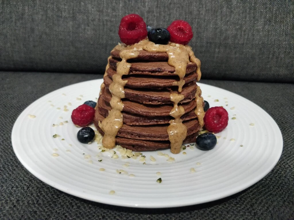 PANQUECAS DE AMÊNDOA E CACAU, uma torre delas para o nosso pequeno-almoço ❤️ O ritual aqui por casa é acordar às 7h30 e preparar o pequeno-almoço para os dois (agora, para os três ahah ??). Foi só misturar farinha de amêndoa, ovo, claras de ovo e cacau puro em pó. Mexer bem e colocar na frigideira antiaderente bem quente ? Fazer uma torre delas, rechear com manteiga de amêndoa, sementes de cânhamo e frutos vermelhos ?