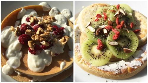Ontem acompanhei com iogurte, frutos vermelhos e nozes! Hoje foi com queijo quark, amêndoas, sementes de chia, bagas goji e kiwi 🙂